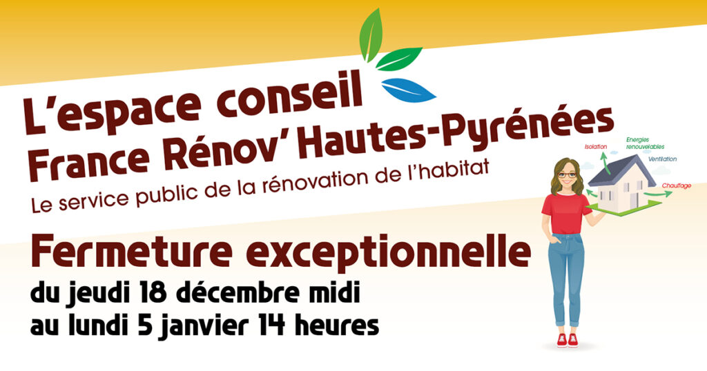L’Espace Conseil France Rénov’ des Hautes-Pyrénées est exceptionnellement fermé du jeudi 18 décembre midi au lundi 5 janvier 14 heures.