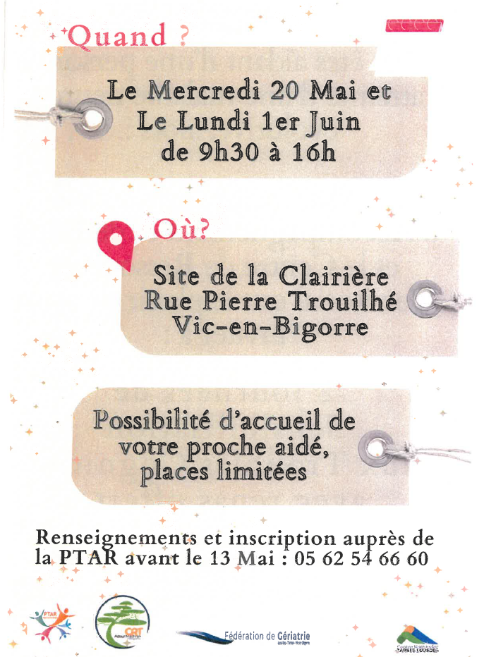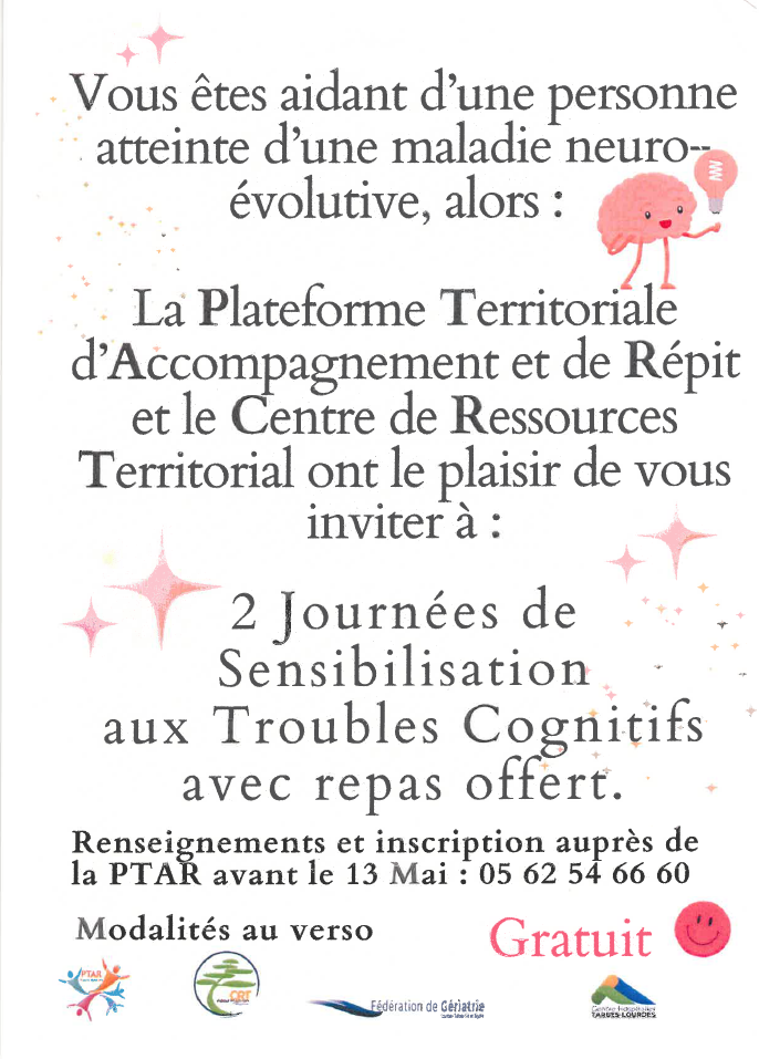 Les équipes de la Plateforme Territoriale d’Accompagnement et de Répit (PTAR) et du Centre de Ressources Territorial (CRT) de Vic en Bigorre invitent les Aidants ayant un proche concerné et âgé de + 60 ans à 2 journées de sensibilisation aux troubles cognitifs