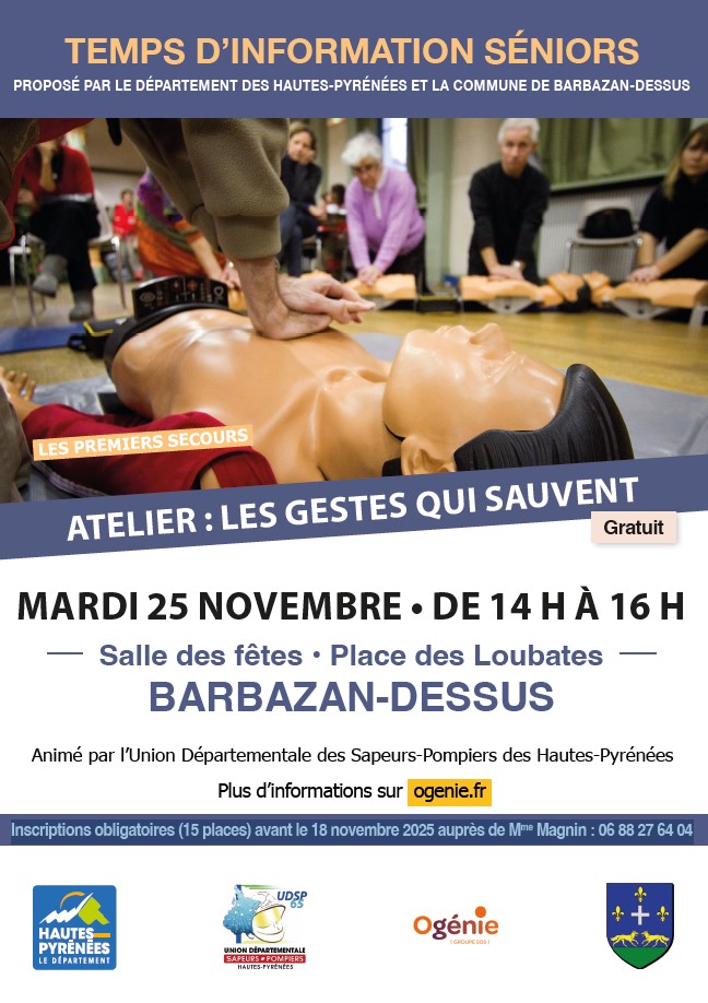 Inscriptions obligatoires (15 places) avant le 18 novembre 2025 – ATELIER PREVENTION SENIORS “LES GESTES QUI SAUVENT” / BARBAZAN-DESSUS / 25 NOVEMBRE 2025