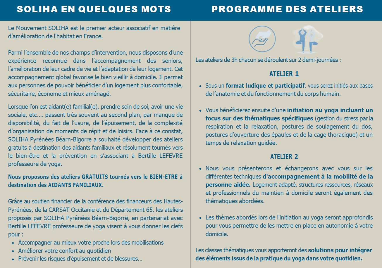 SOLIHA met en place des ateliers gratuits (financés par la conférence des financeurs des Hautes- Pyrénées, la CARSAT Occitanie et le Département 65) à destination des aidants familiaux qui auront lieu en novembre 2025 à Lourdes.