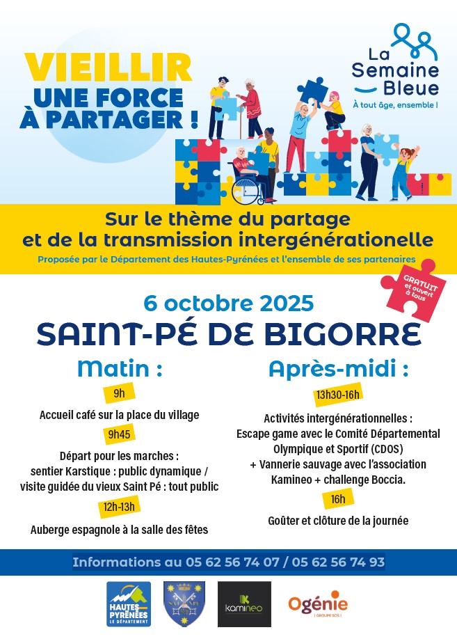 Le Département des Hautes-Pyrénées et la commune de Saint Pé de Bigorre vous invitent à participer à une journée complète d’animations intergénérationnelles dans le cadre de la SEMAINE BLEUE 2025 :