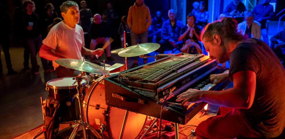 « Piscine » parce qu’il faut bien se jeter à l’eau, directement pour l’envie, et « olympique » parce que l’énergie brute tient la distance et fait beaucoup de bruit. L’association de ces deux musiciens, développée dans les Pyrénées françaises où ils ont enregistré leur premier disque donne une combinaison d’instruments rarement vue ou entendue en duo. Sur ou en contrepoint d’une pulsation rythmique alerte et bouillonnante, les deux mains du pianiste parcourent et défrichent le terrain du Fender Rhodes à la manière d’un pionnier cherchant de l’or dans les eaux profondes d’improvisations échevelées et biberonnées au rock, au jazz ou à la musique contemporaine. Organique et vibrante, cette musique se construit dans l’instant, puissante et décomplexée.